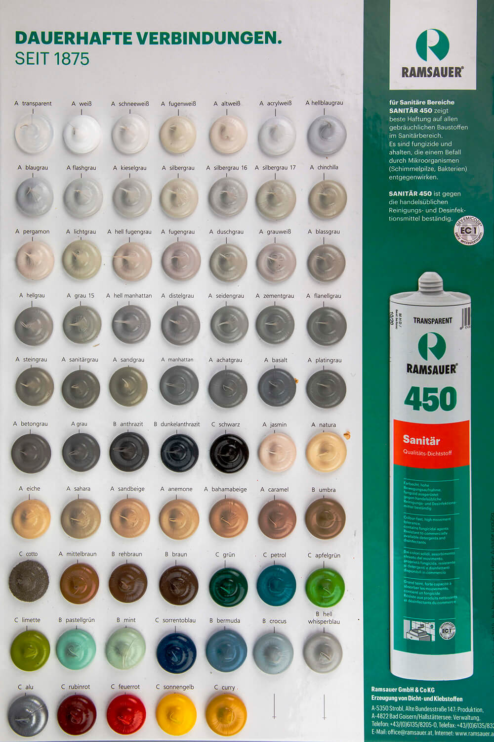 Ramsauer 450 Sanitär выпускается в широкой цветовой гамме — более 80 оттенков, включая стандартные цвета для плитки и сантехники.